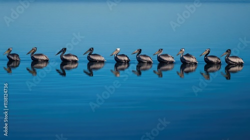 © pinporn manosri, Fototapeta premium Row of Pelicans Gliding on Calm Water Surface in Serene Blue Setting