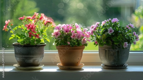 © Boomanoid, Obraz premium Row of potted flowers on window sill