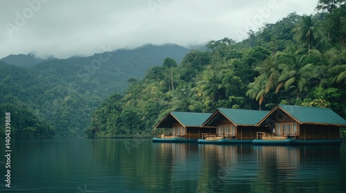 © Pannee, Fototapeta premium Row of raft cabins floating on serene water with lush mountains behind