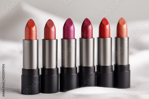 © Studio, Obraz premium Row of six lipsticks in varying shades of red and pink