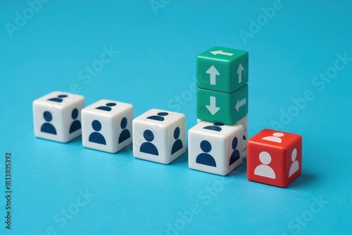 © Media Srock, Obraz premium Row of small cubes marked with human silhouettes illustrates concepts of team dynamics and status differentiation