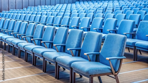Naklejka premium Row of soft blue upholstered chairs await attendees in a vacant auditorium,...