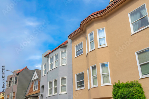 Fototapeta premium Row of townhouses and single-family home in a low angle view in San...