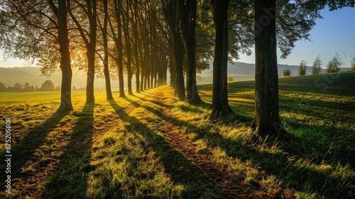 © Patcharaphorn, Naklejka premium Row of trees casting elongated shadows during a tranquil sunrise
