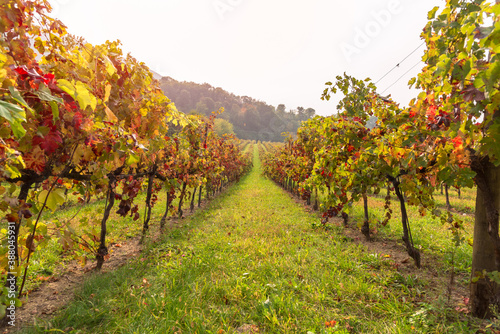 © alpegor, Fototapeta premium Row of vines in a vineyard in autumn