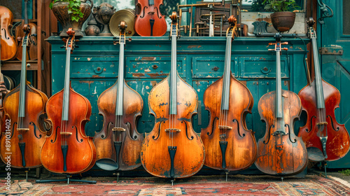© Phuwameth, Naklejka premium Row of Vintage Double Basses on Display