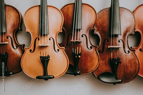© Hurgan, Naklejka premium Row of violins hanging, various shades of wood. Detailed view of instruments