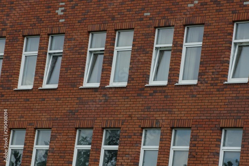 Fototapeta premium row of white windows on a brown brick wall of a building