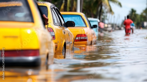© kl yanii, Fototapeta premium Row of yellow cabs are submerged in water. The scene is chaotic and disorganized. The water is murky and the cars are covered in mud. The people walking by are likely trying to avoid the water