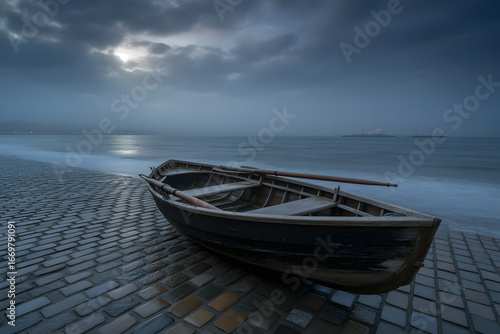 © Salam Shakil, Naklejka premium Rowboat on a cobblestone beach under a cloudy sky wooden boat