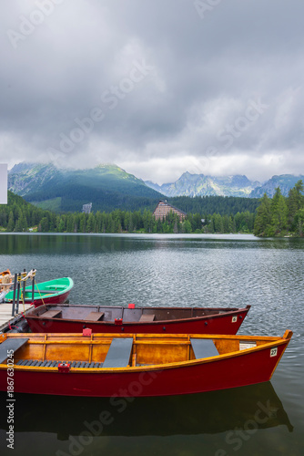 © Richard Semik, Fototapeta premium Rowboats waiting at Strbske Pleso lake, High Tatras