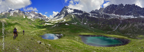 Fototapeta premium Rowerzyści w Alpach, między jeziorami i górami