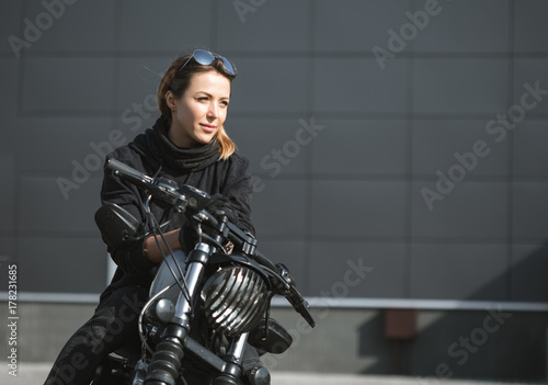 © Kaponia Aliaksei, Fototapeta premium rowerzysta kobieta siedzi na motocyklu