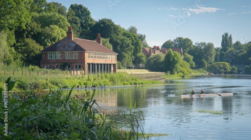 © amorn_m, Obraz premium Rowing on a River with a Brick Boathouse.