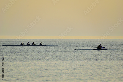 Naklejka premium rowing (skiff) at sunset - Paralia Richa Nera (beach), Myrina, Lemnos island, Greece, Aegean sea