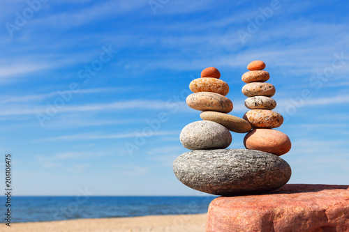 Fototapeta premium Równowaga kamieni na tle błękitnego nieba i morza