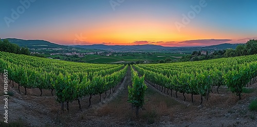 © ART IMAGE DOWNLOADS, Obraz premium Rows grapevines villages hills background France.