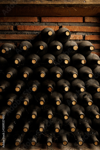 © 9parusnikov, Obraz premium Rows of Aged Wine Bottles in a Rustic Cellar