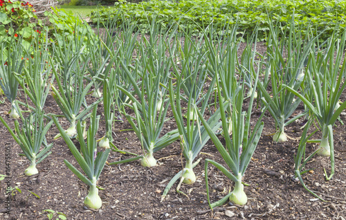Obraz premium Rows of big onions growing in a vegetable garden .