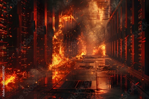 © lertsakwiman, Fototapeta premium Rows of Blazing Server Racks in an Industrial Catastrophe Amid Electrical Sparks and Ominous Haze