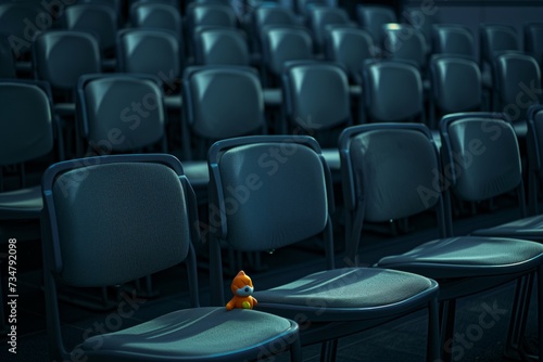 Naklejka premium rows of chairs with a lone childs toy forgotten on a seat