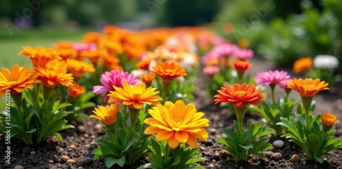 © Rachanon, Fototapeta premium Rows of colorful flowers neatly planted in a well-maintained garden bed, petals, design, organized