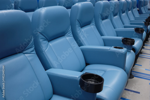 Fototapeta premium rows of comfortable powder-blue leather seats with built-in cup holders in a...