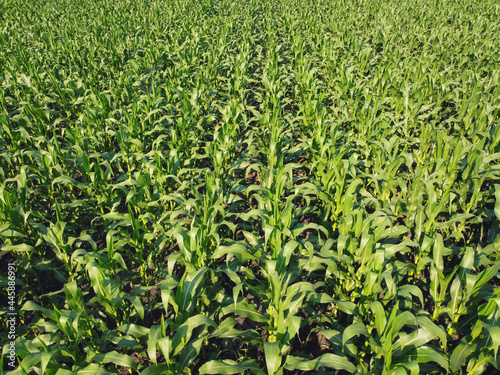 © Mediagfx, Fototapeta premium Rows of corn on field from top view.