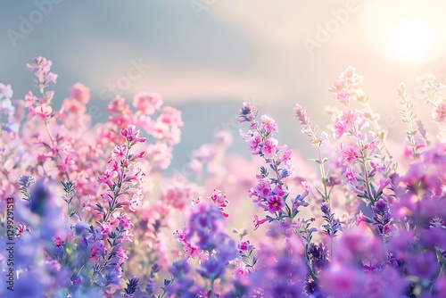 © tayyaba, Naklejka premium Rows of delicate pink and purple statice flowers under a bright, sunny sky, their papery petals shimmering in the light.