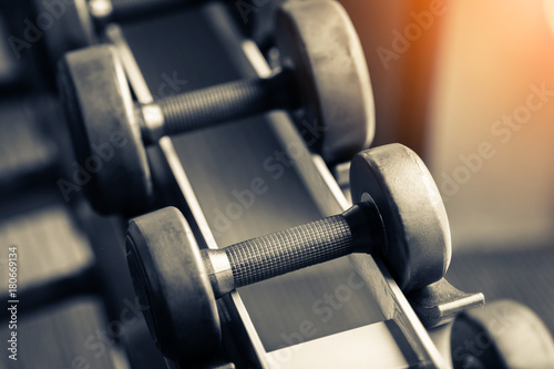 Naklejka premium Rows of dumbbells in the gym with hign contrast and color tone sport and...