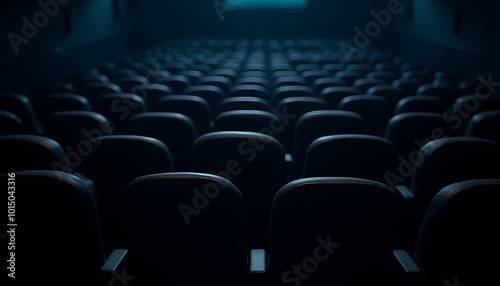 Naklejka premium Rows of elegant black seats in a modern cinema, the soft glow of the screen...