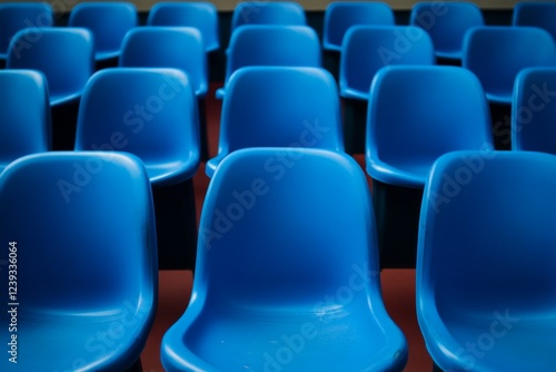 © Yevhen, Fototapeta premium Rows of empty blue plastic stadium seats awaiting spectators for upcoming sports events