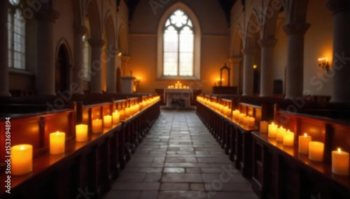 Fototapeta premium Rows of flickering candles illuminate a rustic church interior, creating a...