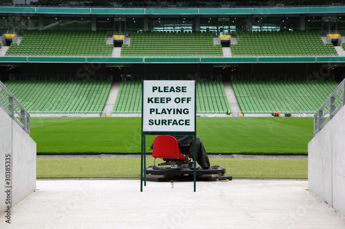 © Pavel Losevsky, Fototapeta premium Rows of folded, green, plastic seats in very big, empty stadium,