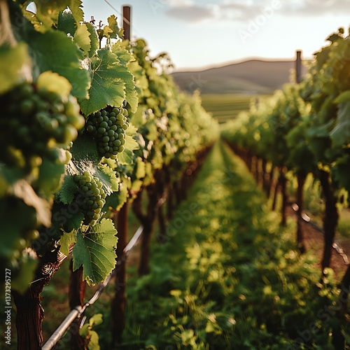 © Tumi, Fototapeta premium Rows of grape vines on a sunny vineyard hillside landscape