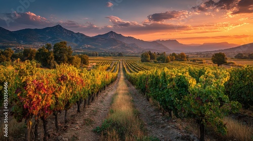 © mila103, Fototapeta premium Rows of grapevines fill the landscape with autumn colors as they stretch towards majestic mountains. A stunning sunset bathes the vineyard in warm, golden light, enhancing the scenery.
