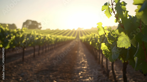 © Nadiyah, Fototapeta premium Rows of grapevines in a vineyard at sunrise with sun rays shining through the leaves.
