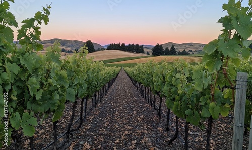 © Resni AI, Fototapeta premium Rows of grapevines in a vineyard at sunset, leading to rolling hills under a soft pink sky.