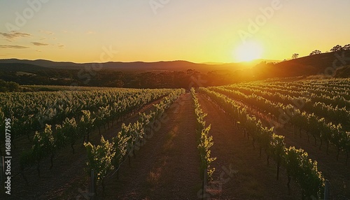 © Studicon, Fototapeta premium Rows of grapevines stretch across the landscape as the sun sets behind distant mountains, casting a warm golden light.