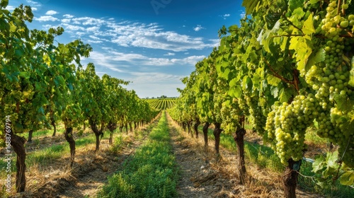 Naklejka premium Rows of grapevines stretch into the distance, laden with ripe green grapes.