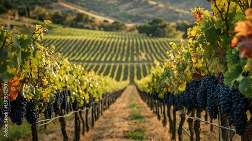 Fototapeta premium Rows of grapevines stretching across a vineyard.