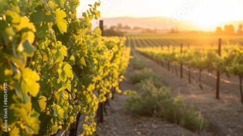 © AlfaSmart, Naklejka premium Rows of grapevines stretching into the distance and the sky painted in warm hues