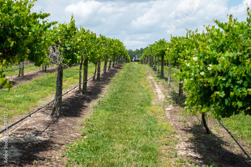 © Dolores Harvey, Naklejka premium Rows of grapevines, trees, and cultivated plants on trellises. The farmlands' spring crop is a green grape for wine production. Between each row of vines are rows of green grass. The sky is cloudy.