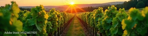 © sarunya, Fototapeta premium Rows of green grapes in a vineyard at sunrise, landscape, winery
