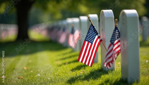 © Pete, Naklejka premium Rows of headstones at military cemetery. American flags decorate graves on Memorial Day. Symbol of respect to fallen soldiers. Honoring veterans who served the country.