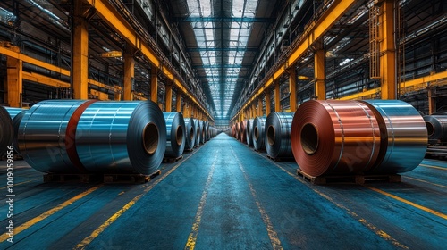 © naila mutmainah, Fototapeta premium Rows of large metal spools inside a large warehouse.