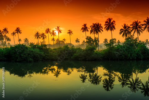 © kosmos111, Naklejka premium rows of palm trees reflected in a lake at dawn. Tinted.