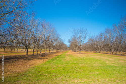 Obraz premium Rows of pecan trees and green grass in the south during the Fall