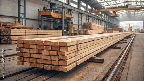 Fototapeta premium Rows of processed spruce planks neatly arranged in stacks at a timber depot,...