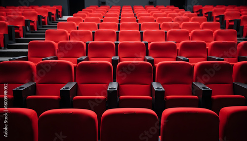 © Yasin, Fototapeta premium Rows of red cinema seats in an empty movie theater, waiting for the audience.